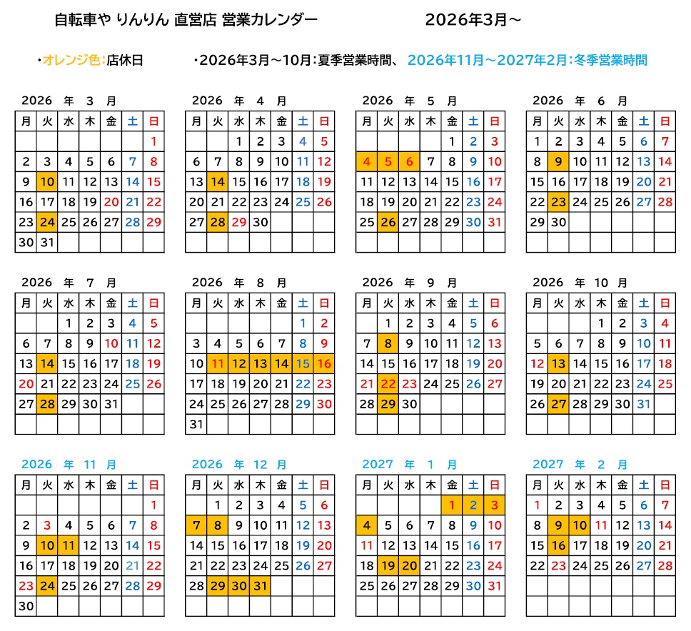 自転車やりんりん 営業カレンダー:通常10:00~19:00 冬季(11月1日~翌2月末日10:00~18:00)🍊色は店休日
