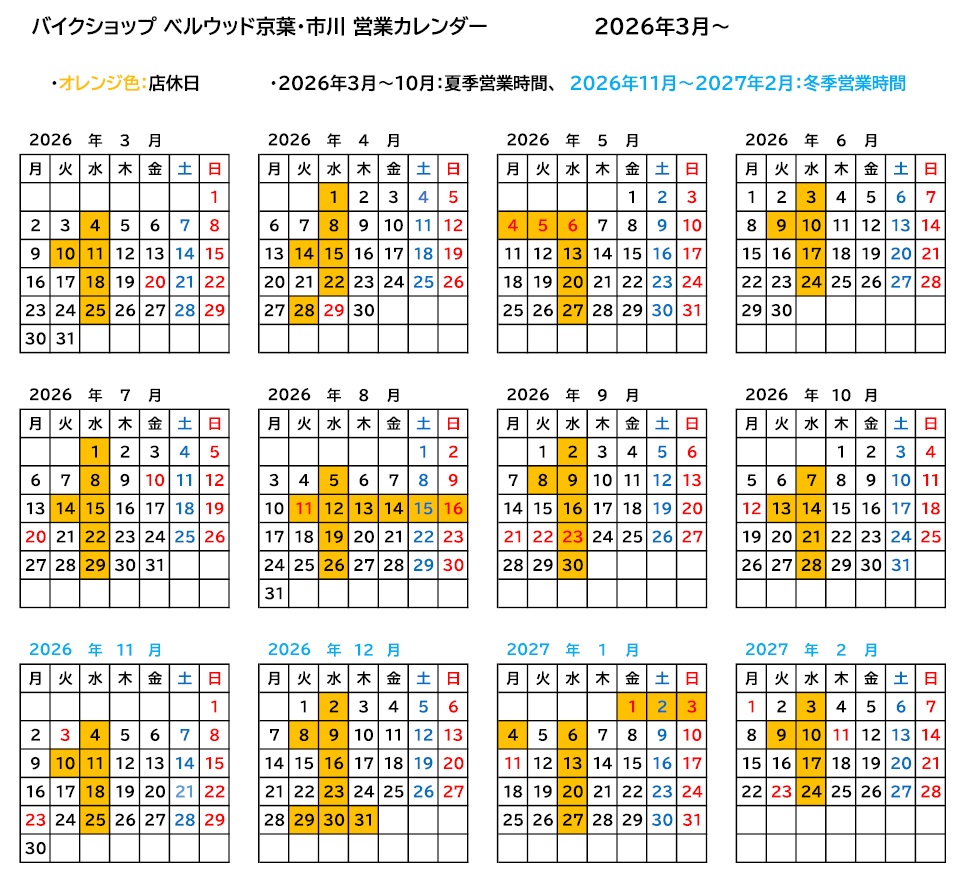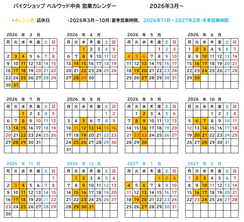 バイクショップベルウッド 営業カレンダー:通常10:00~19:00 冬季(11月1日~翌2月末日10:00~18:00)🍊色は店休日